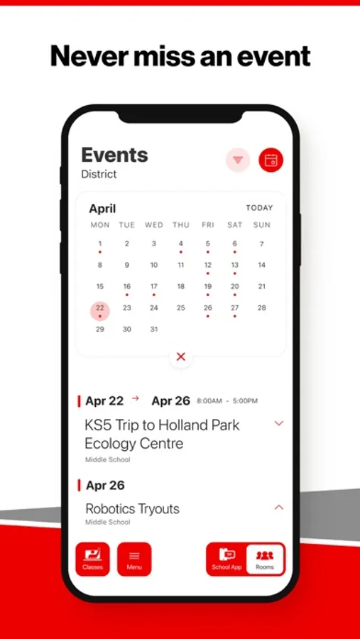 The event section shows a list of events throughout the district. Users can add an event to their calendar to share the event with friends and family with one tap.