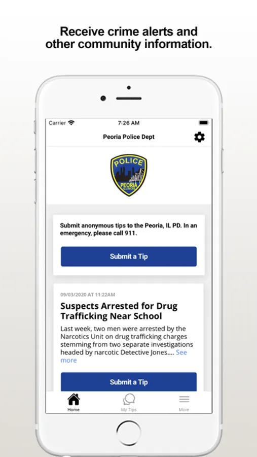 The Peoria PD app provides citizens the ability to submit anonymous tips to the Peoria, IL Police Department. The app also displays agency crime alerts and other organization web and social media content.