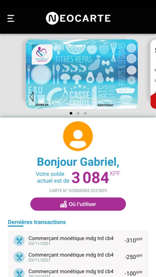 Application mobile permettant de visualiser et gérer son compte NeoCarte et toutes les opérations effectuées.