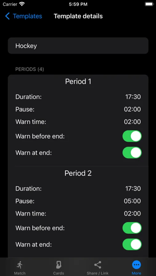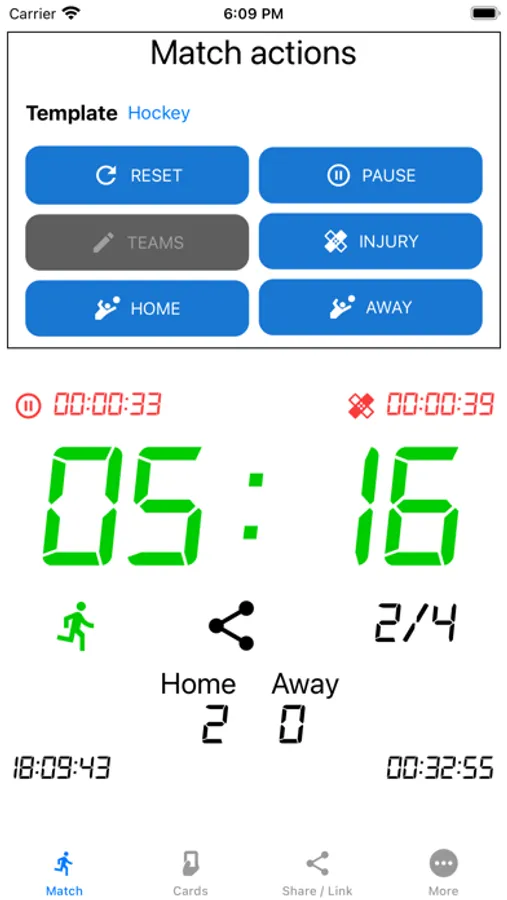 - all match settings can be saved as a template, so that for example with a regular soccer match (2 x 45 minutes) and youth soccer (4 x 15 minutes) can be selected quickly