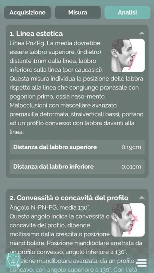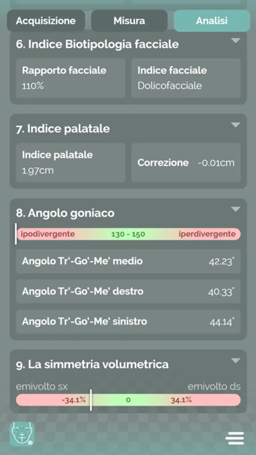 Il report è poi implementato da valori di natura antropometrica che permettono la analisi dei volumi e delle simmetrie facciali.
