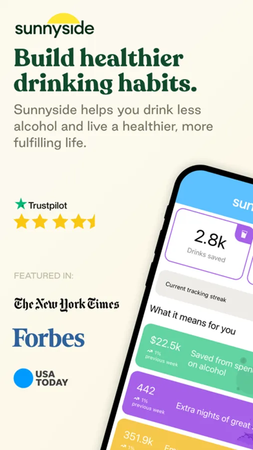 Sunnyside is the only alcohol tracking, planning, and coaching app focused on mindful drinking and moderation, not sobriety. It’ll help you reframe your relationship to alcohol in no time.