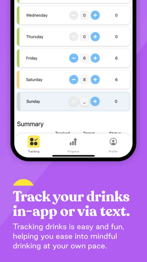 Via a simple interface in-app (or via text message), we make alcohol tracking easy, and provide nudges to help you stay on target.