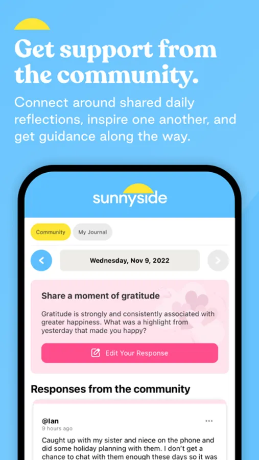 Our new community feature lets you connect with others in the community around a shared daily prompt that helps you stay positive and mindful every day. It’s the perfect way to support those around you and get a bit of support and validation for yourself.