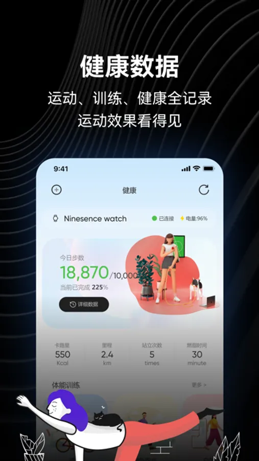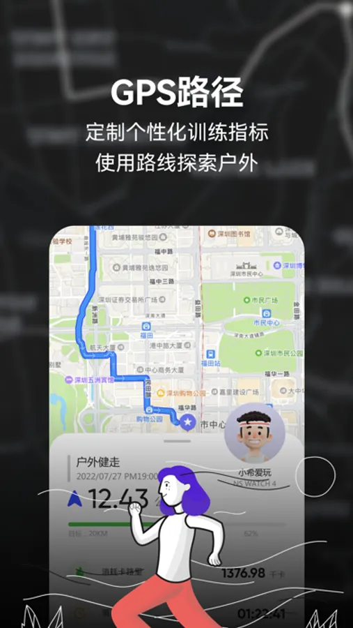 4、通过手表运动功能将记录的数据同步到App中,让你在运动过程中快速了解自己的目标完成进度等。