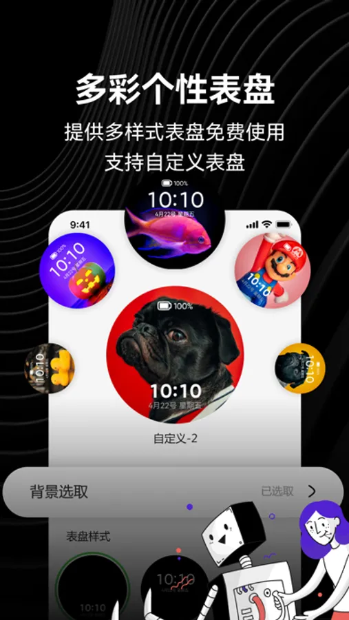 5、可以通过App以及手表切换不同款式风格的表盘和自定义表盘,让您体验不同款式的快乐心情。