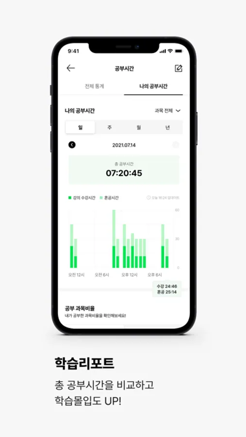어제와 오늘의 수강시간을 비교하고, 과목별 학습패턴과 주간 학습 추이를 확인해보세요.