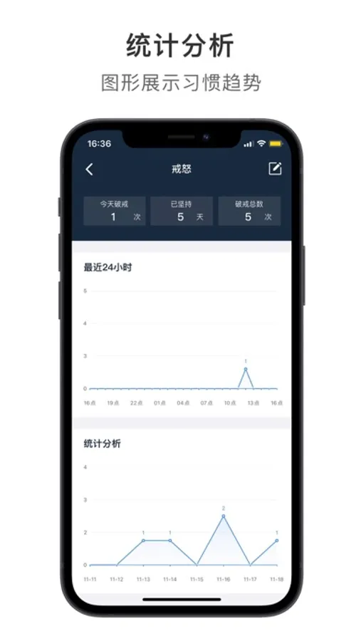 -- 清晰的统计分析,提供最近24小时、7天的习惯统计,更专注于执行力;