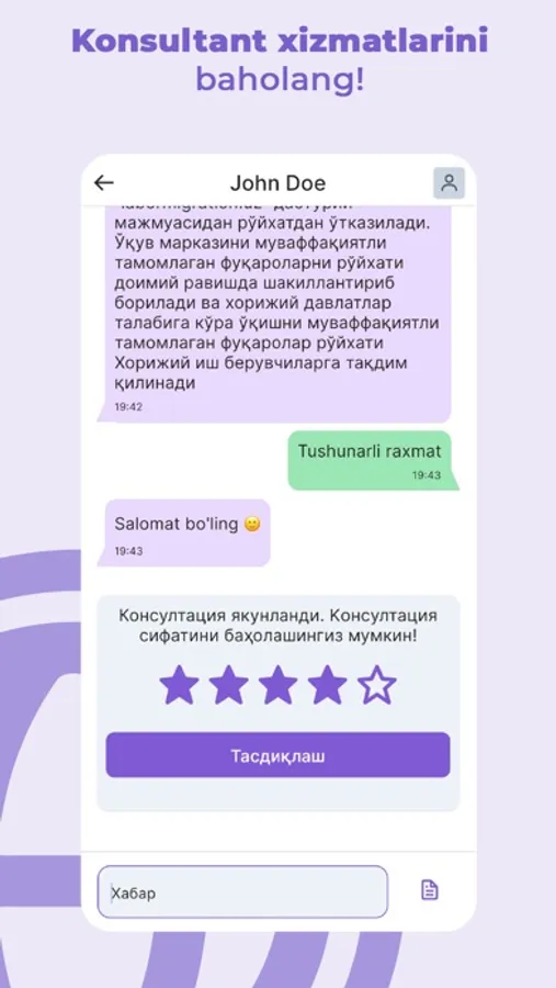 Migrant Maslahatchisi mobil ilovasi Tashqi mehnat migratsiyasi agentligi va YHXTning O'zbekistondagi loyihalar koordinatori tomonidan tomonidan yaratilgan. Mobil ilova orqali xorijga qonuniy tartibda mehnat faoliyatini amalga oshirish uchun ketayotgan mehnat migrantlari mobil ilova orqali o‘zlarini qiziqtirgan barcha savollarga javob olishlari va Tashqi mehnat migratsiyasi agentligi tomonidan ko‘rsatiladigan xizmatlar bilan tanishib chiqishlari mumkin. Mobil ilovaning maqsadi chet ellarda mehnat faoliyati bilan shug‘ullanadigan va shu kabi faoliyatni amalga oshirishni istagan vatandoshlarga maslahat va axborot yordamini taqdim etishdir. Bu yerda O‘zbekiston Respublikasi Bandlik va mehnat munosabatlari vazirligi huzuridagi Tashqi mehnat migratsiyasi agentligining mas'ul xodimlari, boshqa manfaatdor vazirlik va idoralarning malakali mutaxassislari jalb qilingan. Mutaxassislar sizga bepul, tezkor va malakali maslahatlarni berishadi.