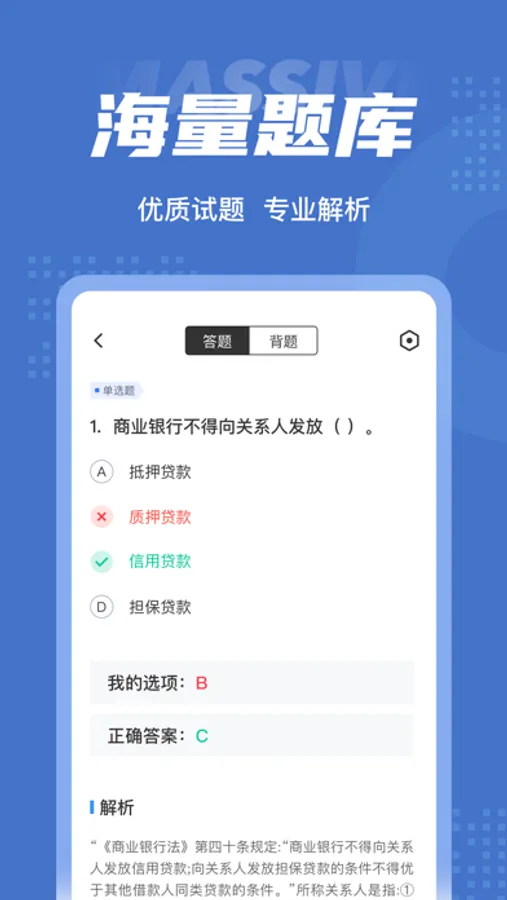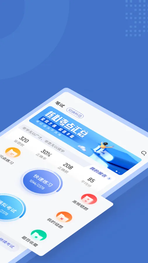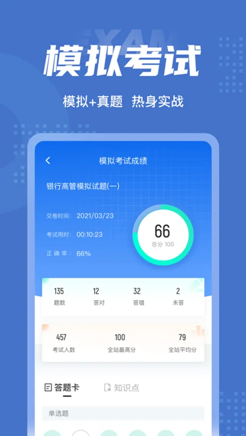 银行高管题库内含考点练习,全国通用卷以及地区卷模拟练习,以及按照固定考试比重的随机式的抽题的真题考场,成绩单实时记录考试数据,一点一滴的反馈考生近期学习状态以及自我正确率的提升,大大的给予考生通过考试的信心。
