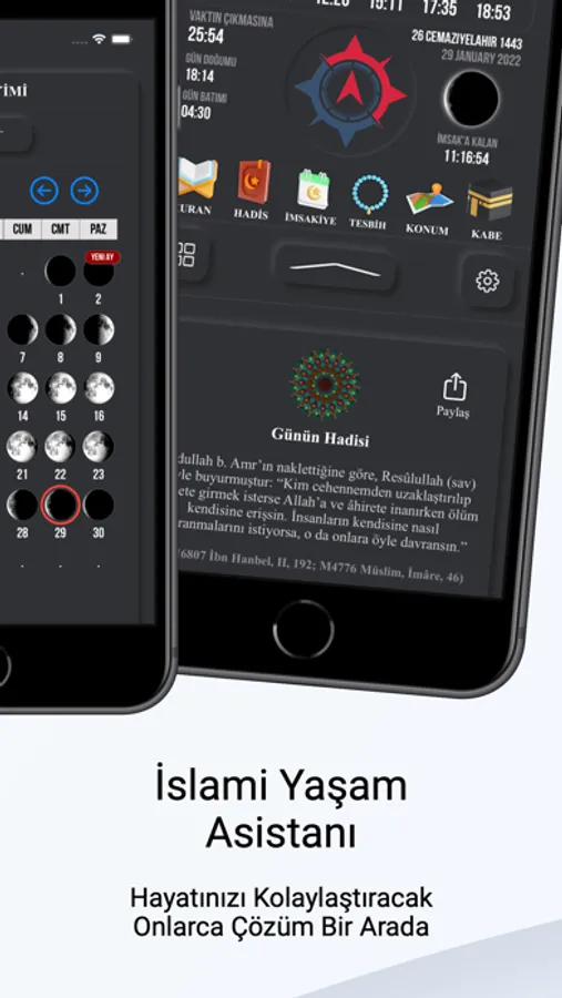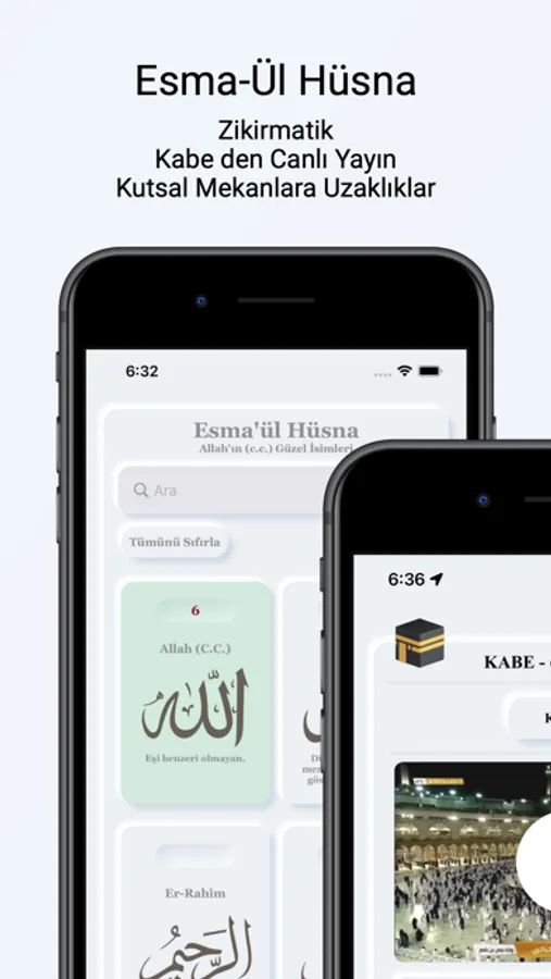 Kabe den canlı yayın alıp, Kabe, Mescit-i Aksa, Mescit-i Nebevi, İmam Ali Türbesi gibi konumların bulunduğunuz yere mesafelerini görebileceksiniz.
