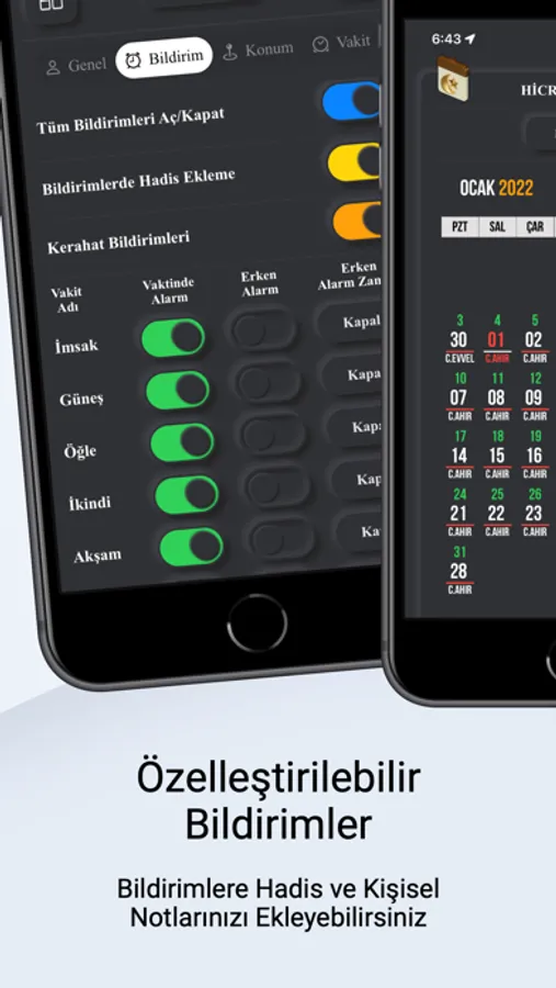 Namaz Vaktinde ve Öncesinde İsteğe bağlı bildirimler ayarlayabilir, ayrıca bu bildirimlere Hadis-i Şerif veya hatırlatma notu ekleyebilirsiniz.