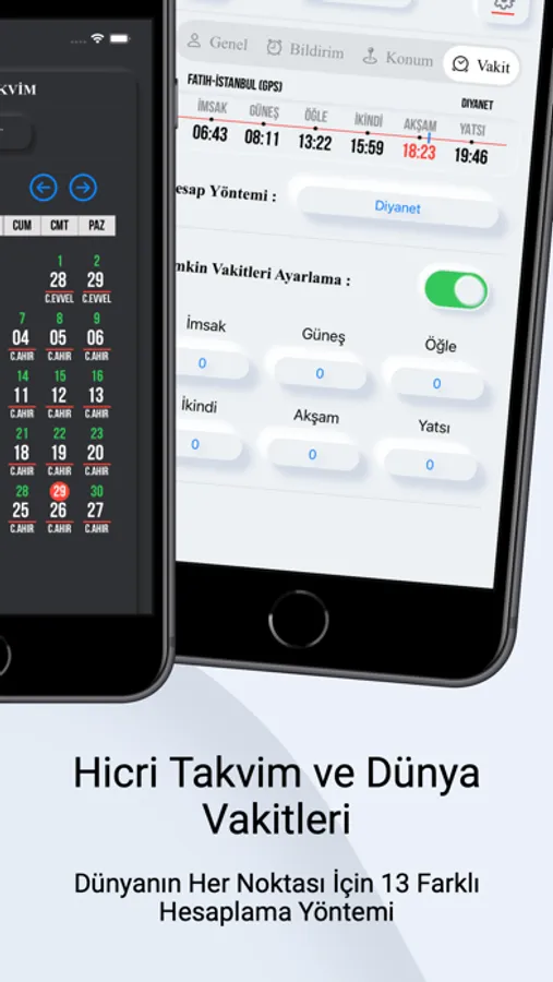 13 farklı hesap yöntemi ile namaz vakitleri isteğe bağlı olarak hesaplanmaktadır.