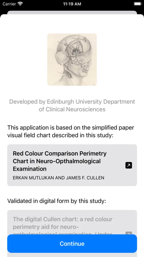 This app is based on a previously validated paper chart (the Cullen chart) and used to assess visual fields. It is intended for use by a trained clinician and has been designed specifically for pituitary and parasellar pathology. The chart tests the central 25 degrees of the visual field.