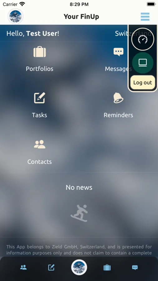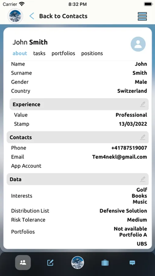 Our App has 5 key functionalities. They are "Contacts", a simplified CRM tool where you can manage clients and prospects, "Tasks" for your daily task management, "Positions", a ranked list of individual investments on your current portfolio radar, "Portfolios", a bundle of investment portfolios either for actual clients of our firm or our simulated views on the market and model portfolios for prospective clients and the general public, and "Messages", our dedicated and secure communication channel.