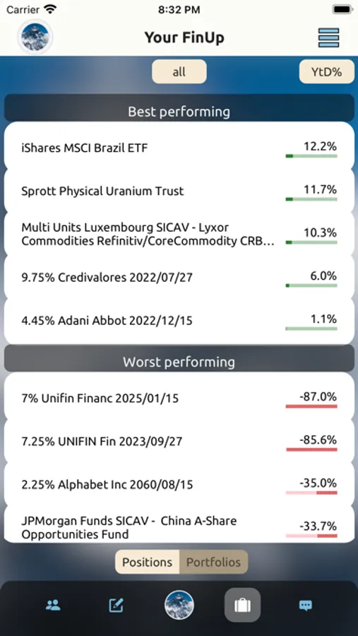 - Simple and intuitive design of the portfolio table with interactive headings and the ability to collapse individual investment sections for an enhanced view of the portfolio