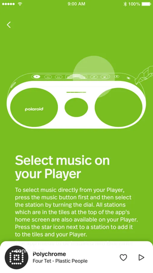Polaroid Music acts as a companion app for Polaroid Speakers. Connect the app and control your Polaroid Speaker with its analog buttons. Now you can change the music, save your favorite Apple Music playlists or internet radio stations, and adjust the sound directly on the player—without picking up your phone. Polaroid Music app also allows you to customize your Polaroid Speaker.