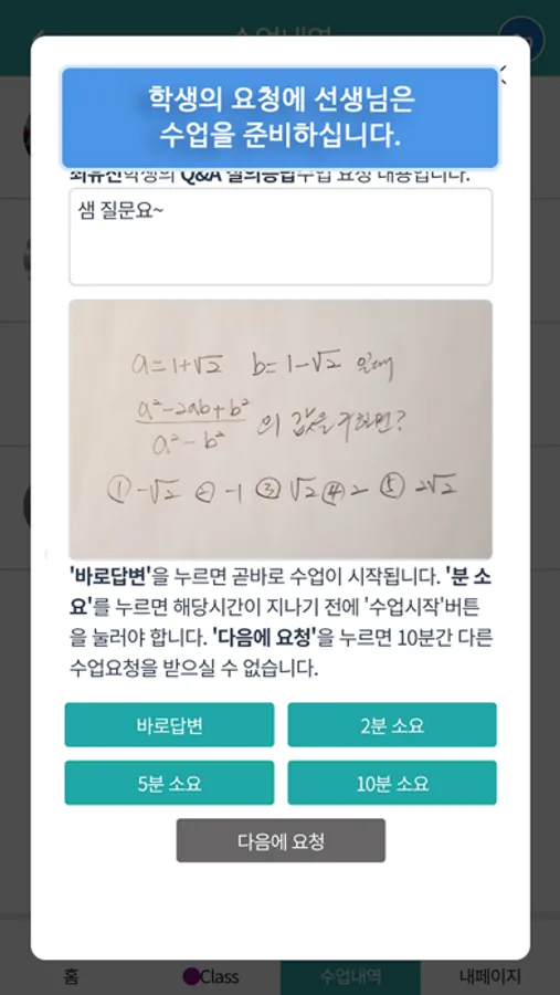 1:1 실시간 질의응답은, 학습도움이 필요한 학생이 지금 당장 학습코칭이 가능한 교사들을 확인하여, 곧바로 학습도움을 받아 문제를 해결할 수 있는 시스템을 제공하고 있습니다.