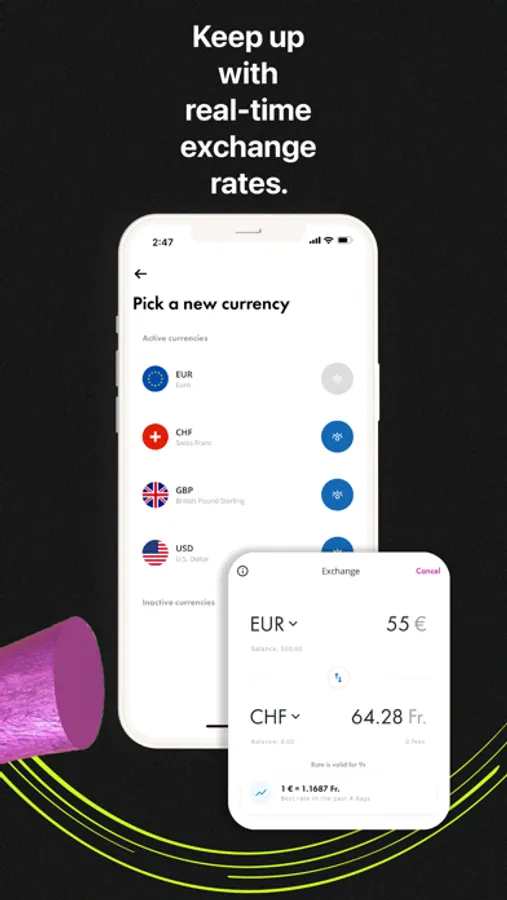 Receive your salary, exchange currencies with real-time rates — all of that at no cost. Together with our local partners, we also offer cash withdrawals and deposits.
