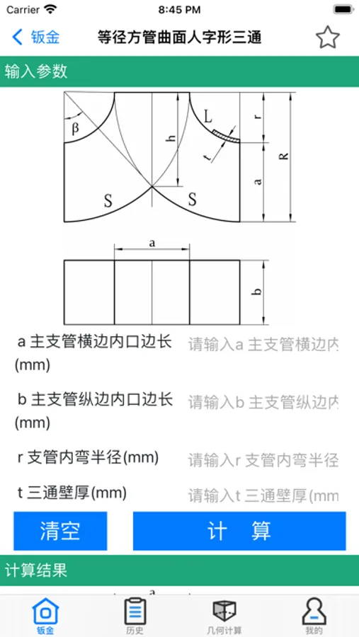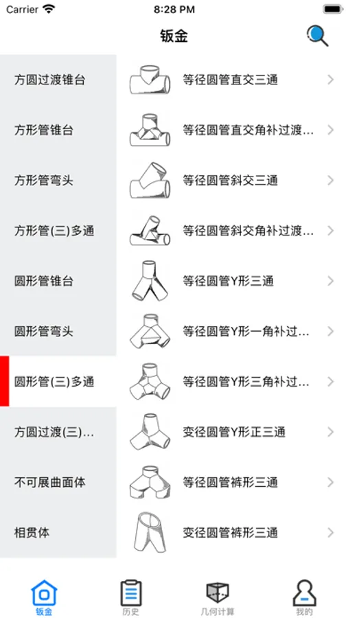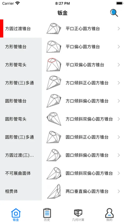 软件包括如下大类的钣金展平样式:方形管锥台、方形管弯头、方形管(三)多通、圆形管锥台、圆形管弯头、圆形管(三)多通、方圆过渡锥台、方圆过渡(三)多通、不可展曲面、相贯体。