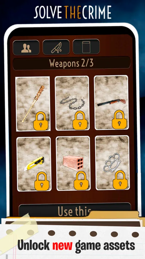 Candlestick, Dagger, Lead pipe, Revolver, Rope, Spanner, Chainsaw, Brick, Cutter, Shotgun. Unlock all weapons!