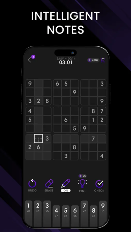 - Auto remove notes from all columns, rows and blocks once the number is placed and also unlimited undo