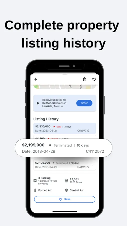 • Get property details like the direction a home is facing, if the basement is finished, the property taxes, HOA/Maintenance fees, age of a home, size of land, and more