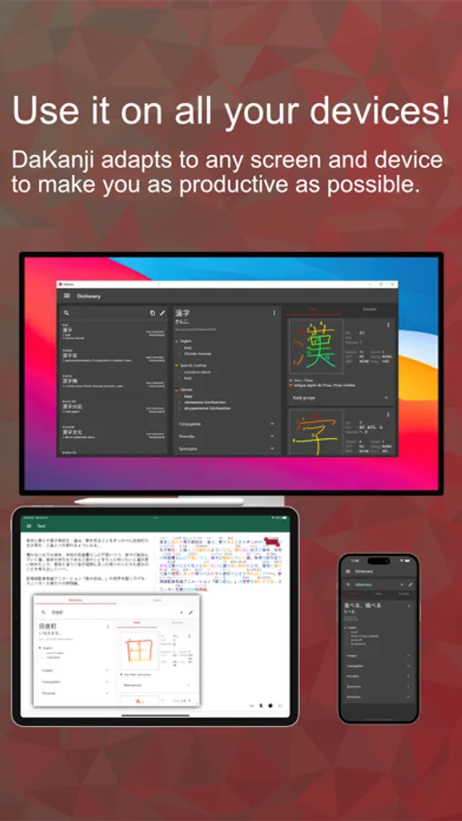 Use the built-in dictionary to look up words in many languages, search Kanjis by simply drawing them, add furigana to texts, and much more!