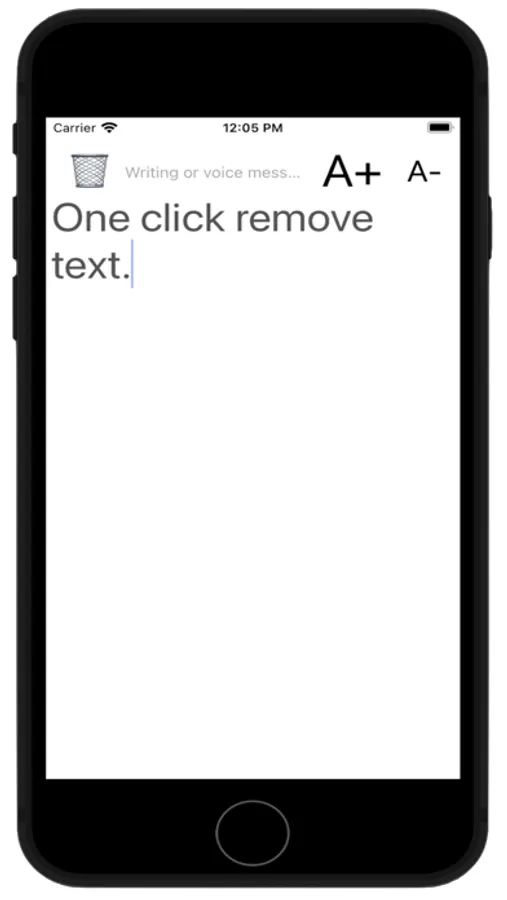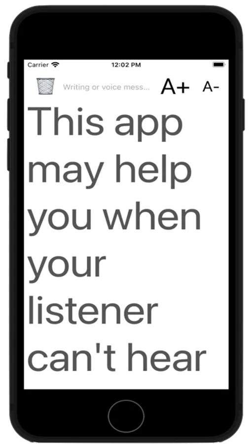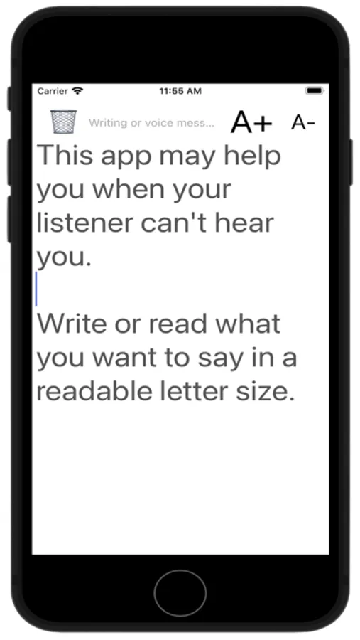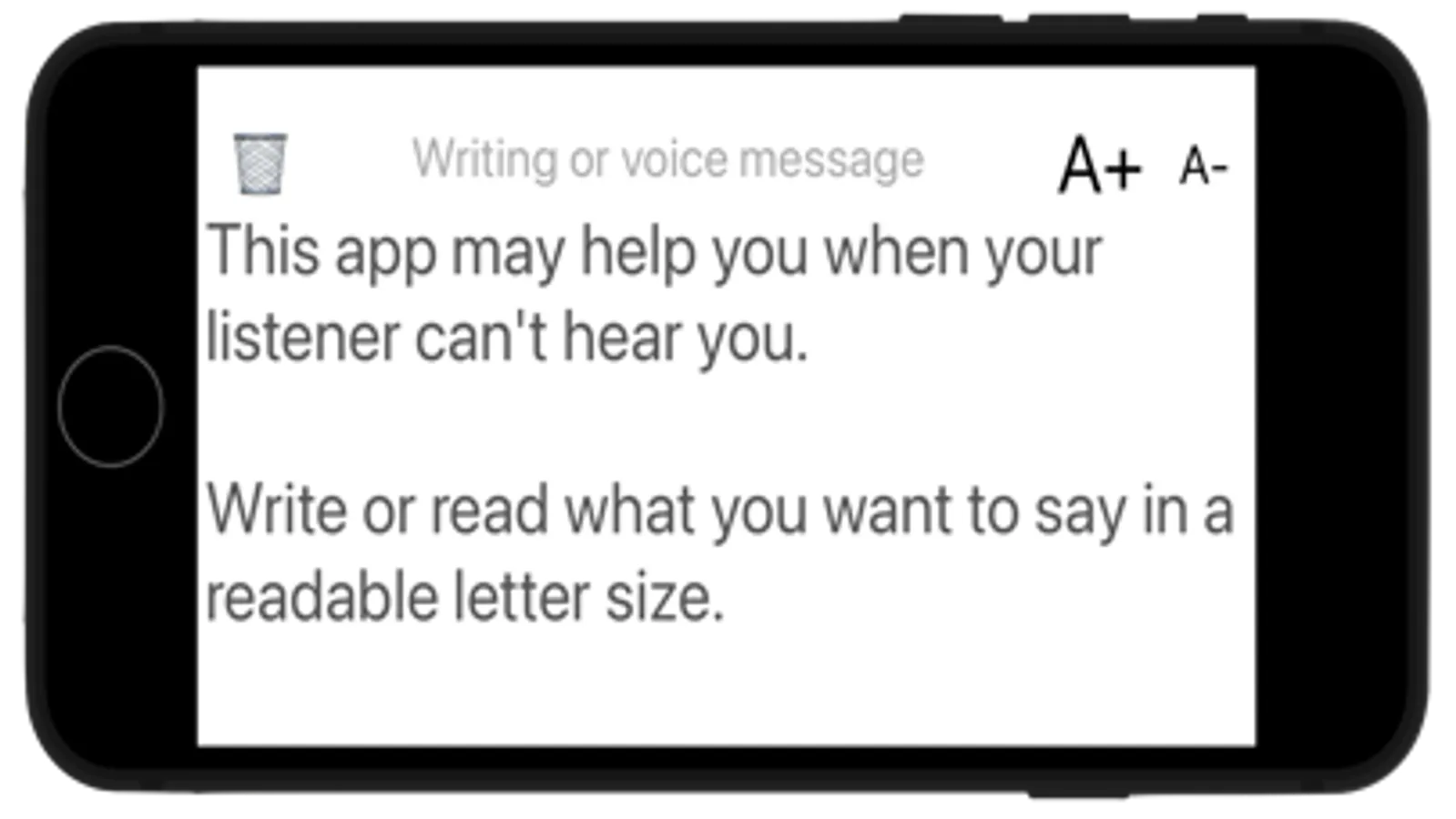 No more need to scream. Write your message or press the microphone and let your voice message be translated to text on the device. Increase or decrease the font size according to the readers ability to read the text. Remove all text with a single press on the trash button.