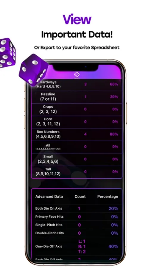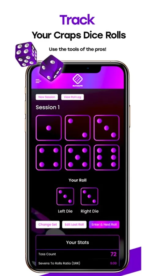 Craps Dice Tracker pro is a craps dice tracking utility for dice throwing professionals, craps enthusiasts, and dice influencers. Craps Dice Tracker Pro allows the user to log their dice rolling sessions and view important stats like "on-axis rolls, SRR(sevens to rolls ratio), and box number hits. The app also allows the user export their saved session to view in .csv format later on their computer or to upload to their external dice tracking software of choice.