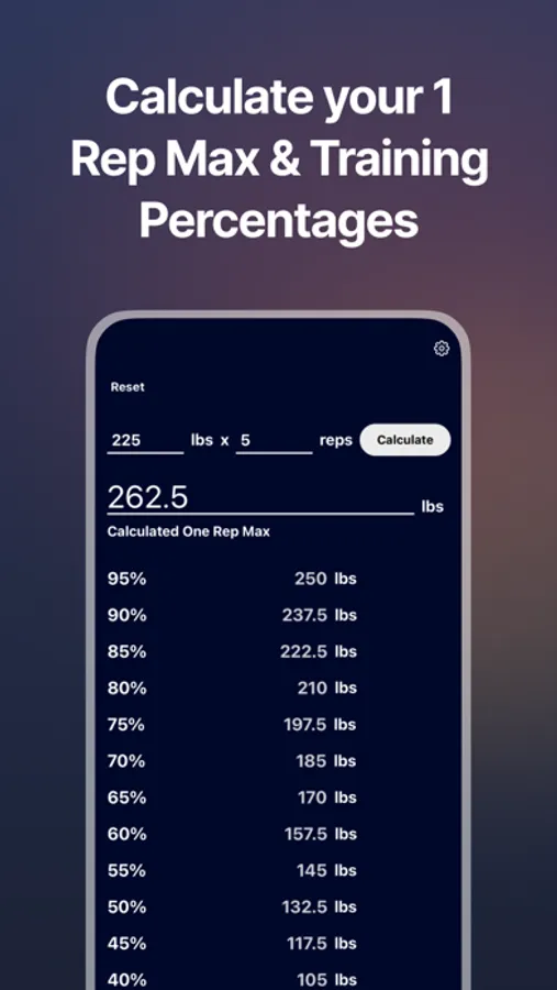 Let CalcuPlator add up plates, show you what to load on the bar, and calculate your 1 rep maxes and training percentages.
