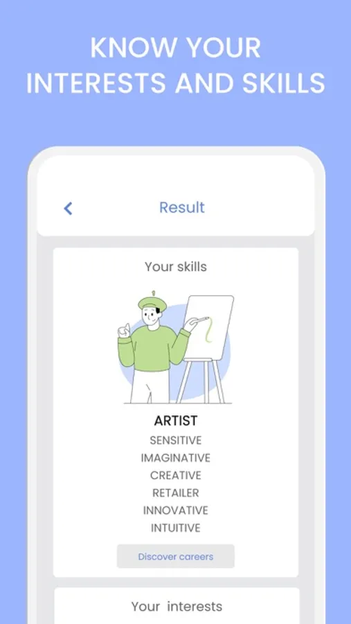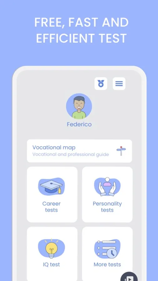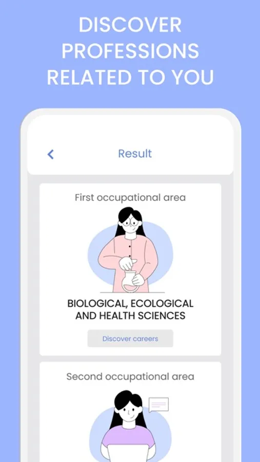 Our app is the ideal companion for exploring your interests and abilities. We have curated a variety of tests and questionnaires based on real research to help you uncover your vocational profile, areas of interest, and professions where you'll excel.