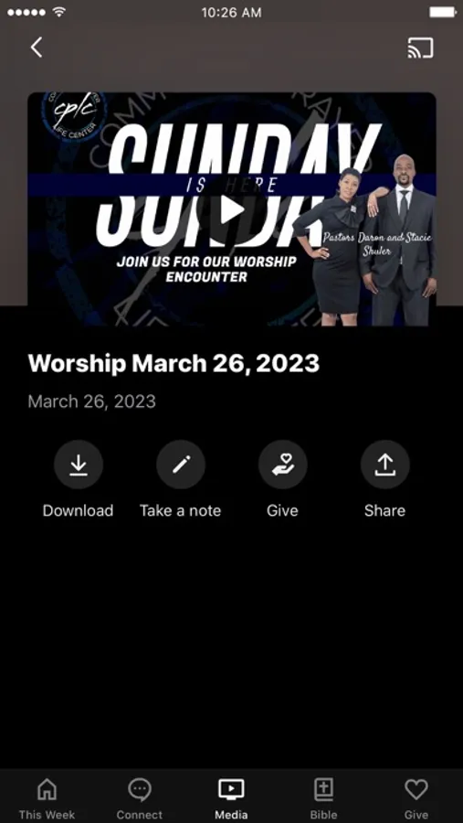 This app will help you stay connected with the day-to-day life of our church. With this app you can: watch or listen to past messages; stay up to date with push notifications; share your favorite messages via Twitter, Facebook, or email; and download messages for offline listening.