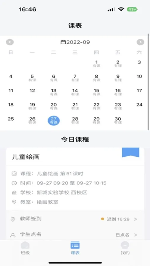 七彩时光教师端主要为提供课后服务的教师(包括校内教师和第三方机构教师)提供课表查询和班级管理服务。教师登录后,可查看自己的任教班级信息,可开展学生点评、学生请假审批等管理工作。在教师课表页面,可针对当日课程进行学生考勤和下课推送操作,方便教师进行教学管理。