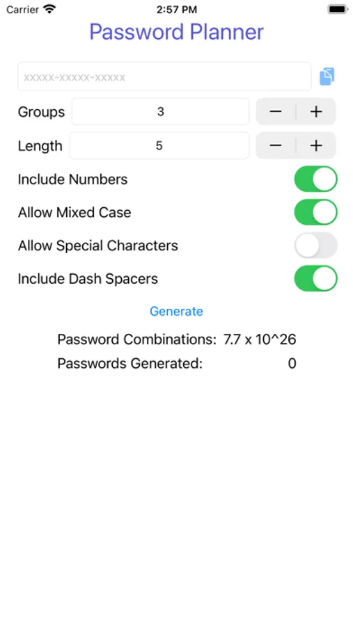 Stop re-using weak passwords. Password Planner is a flexible and configurable password idea generator. The Safari generated strong passwords are great, but not all websites accept the characters used. With Password Planner you can configure whether numbers, mixed-case, dash separators, or special characters are allowed. And you can configure the length and number of groups of characters. Passwords can be copied to iCloud clipboard for use across Apple devices. Generate on your iPhone and paste it on your Mac.