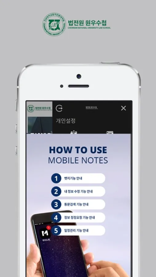 전남대학교 법학전문대학원 원우/동문/교직원만 이용 가능하며, 모바일 수첩에서 사용되는 모든 데이터는 전남대학교 법학전문대학원 학생회에서 직접 관리합니다.