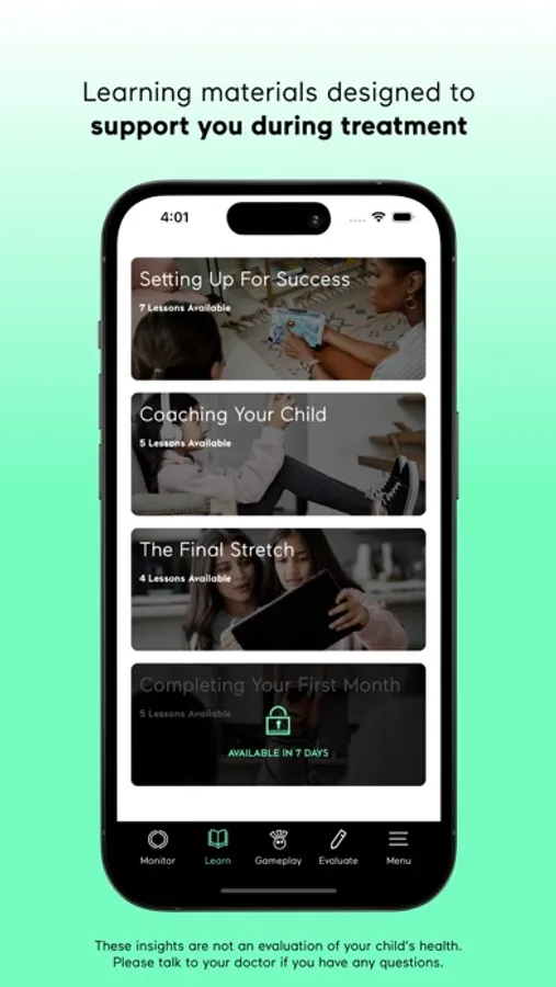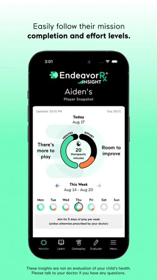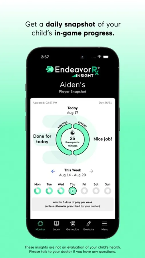 This free app connects directly to your child’s EndeavorRx treatment, so you can get a daily snapshot of your child's in-game mission completion and effort score.