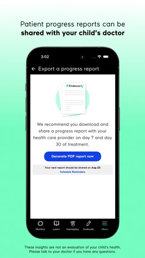 - EXPORT REPORTS — Generate reports and share the results with your child’s health care provider to inform the conversation and treatment planning.
