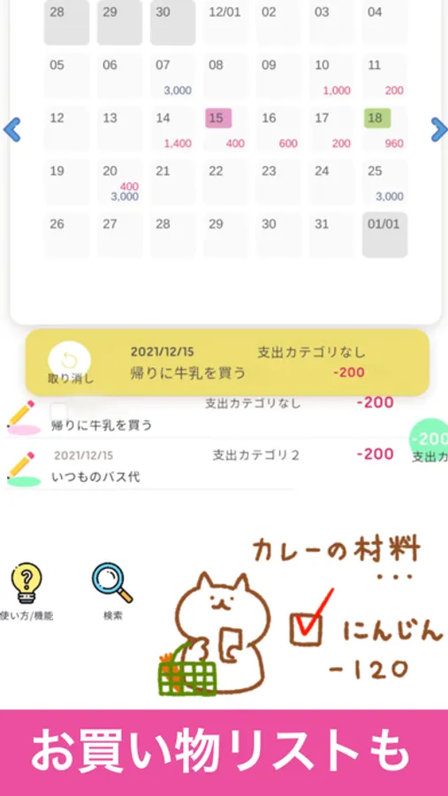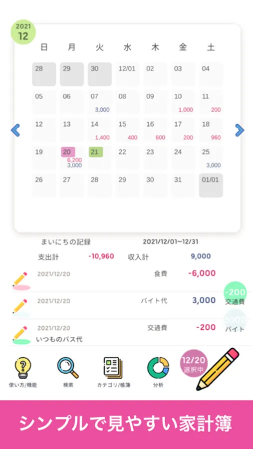 シンプルな操作の家計簿です。毎日の収支から色々なシチュエーションに対応できます。