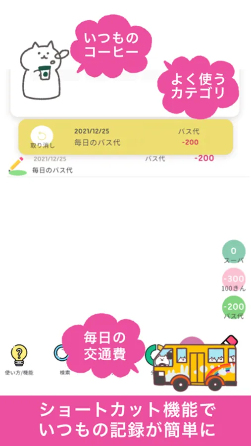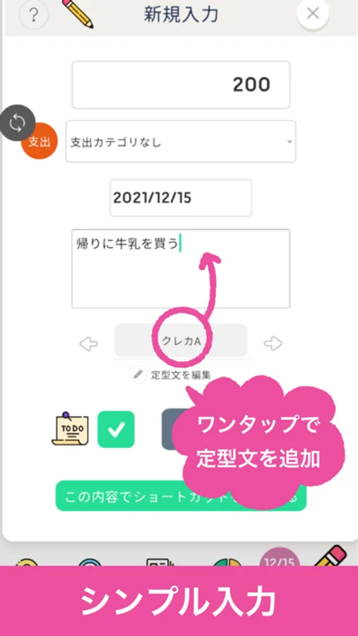 普段使うお店や支払い方法などを登録すれば、ワンタップで色々なメモが完成します。