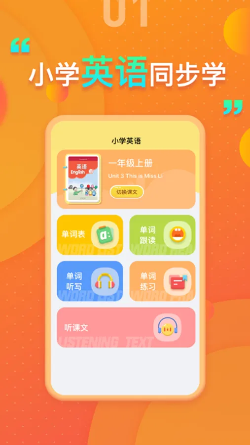 主要功能包含单词表、单词跟读、单词听写、单词练习、听课文等。内容持续更新。