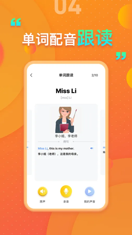 【单词跟读】:完整的单词和短语,配有图片和例句,还可跟读录音,听自己的发单是否标准;
