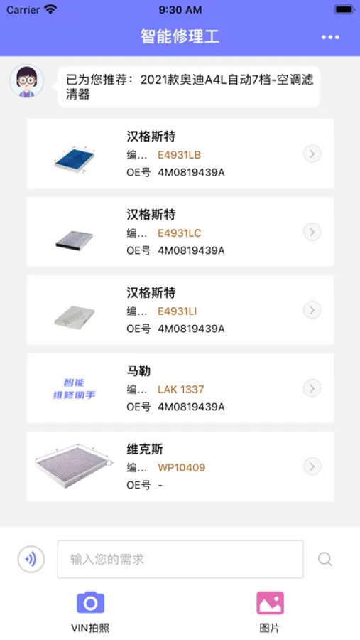 -通过快速的VIN码识别可以查询保养建议、油品数据、易损件数据、OE数据,查个码不仅仅可以识别VIN码还将推出零部件编码查询、品牌件号查询、D码查询等适配车型反查功能。