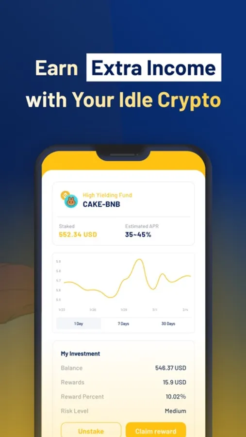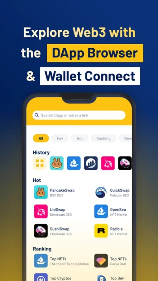 - Built-in DApp browser. Hand selected Defi investments tailored to you. Invest with a single click, and keep track of your return of investment.
