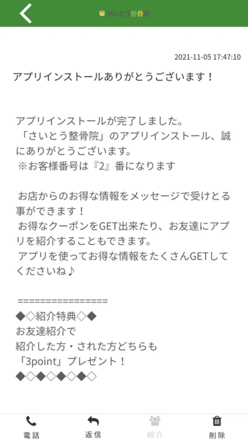 さいとう整骨のアプリをSNSを通じてお友達に紹介する事ができます。