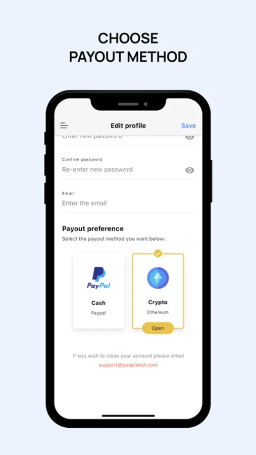 If you choose cash, you simply need a Paypal account to receive your earnings. If you choose crypto, you’ll need an Ethereum wallet. If you don’t have this type of wallet, you can seamlessly get one inside the Peopetail app.