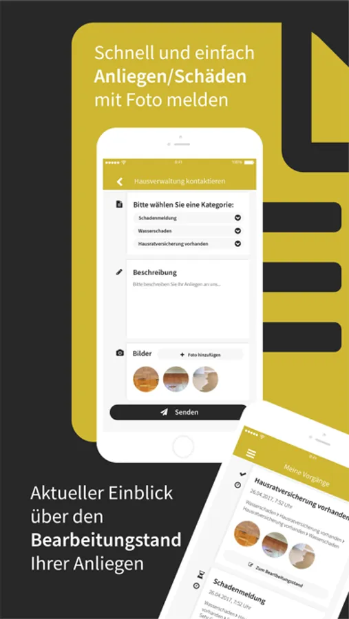 Als Mieter oder Eigentümer können Sie Schäden oder Anliegen direkt mit Fotos über unsere App melden. Ihre Anfragen stehen unseren Mitarbeiten dann zur Verfügung und können auch an Handwerksbetriebe weitergeleitet werden.