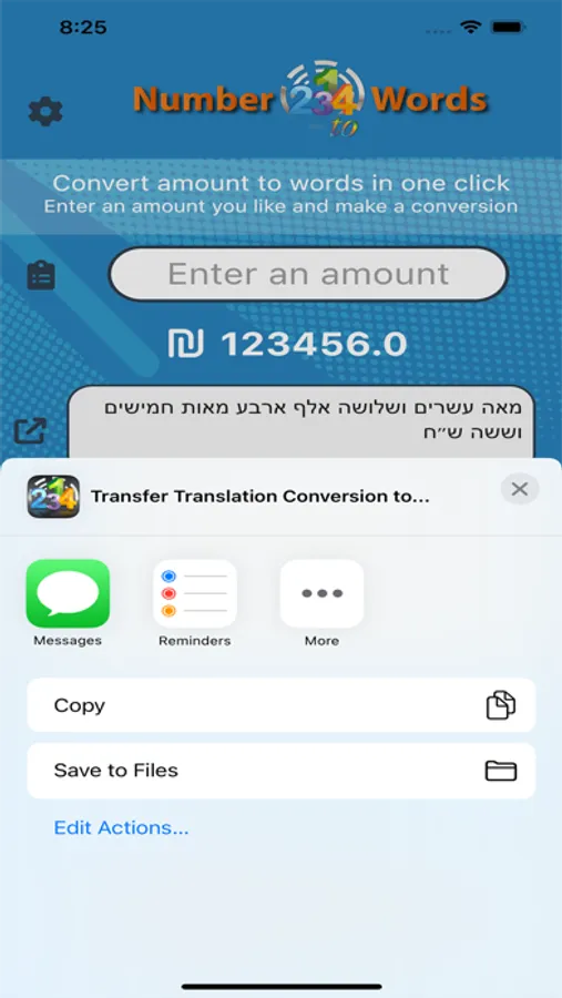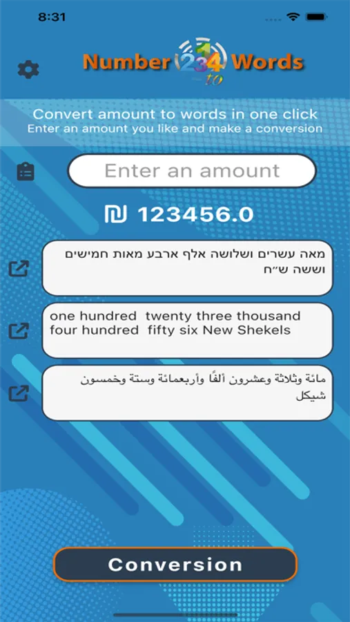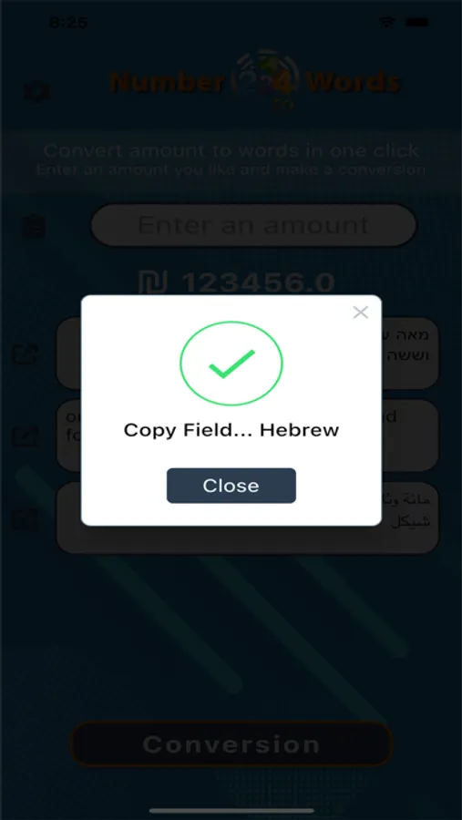 Convert amount to Hebrew and English and Arabic with one click