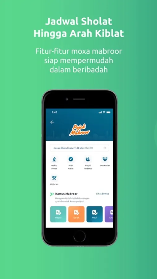 Selain produk keuangan, ada fitur-fitur Islami lainnya yang memudahkanmu beribadah setiap hari, yaitu waktu shalat, arah kiblat, lokasi masjid terdekat, bacaan doa harian, dan Al-Qur'an.