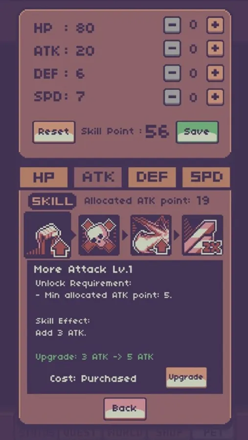 - Learn new powerful skills based on your status (HP, ATK, DEF, SPD).